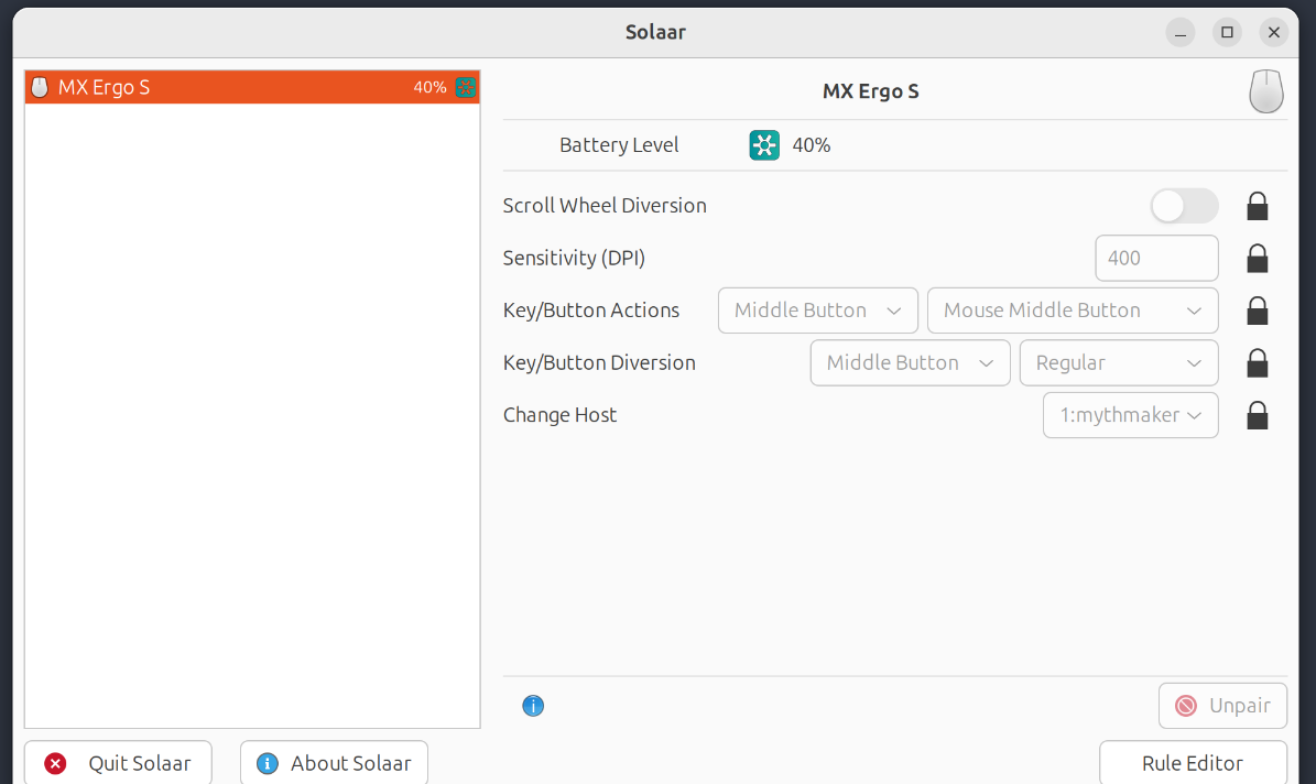 Solaar is a Linux manager for many Logitech keyboards, mice, and other devices that connect wirelessly to a Unifying, Bolt, Lightspeed or Nano receiver as well as many Logitech devices that connect via a USB cable or Bluetooth. Solaar is not a device driver and responds only to special messages from devices that are otherwise ignored by the Linux input system.